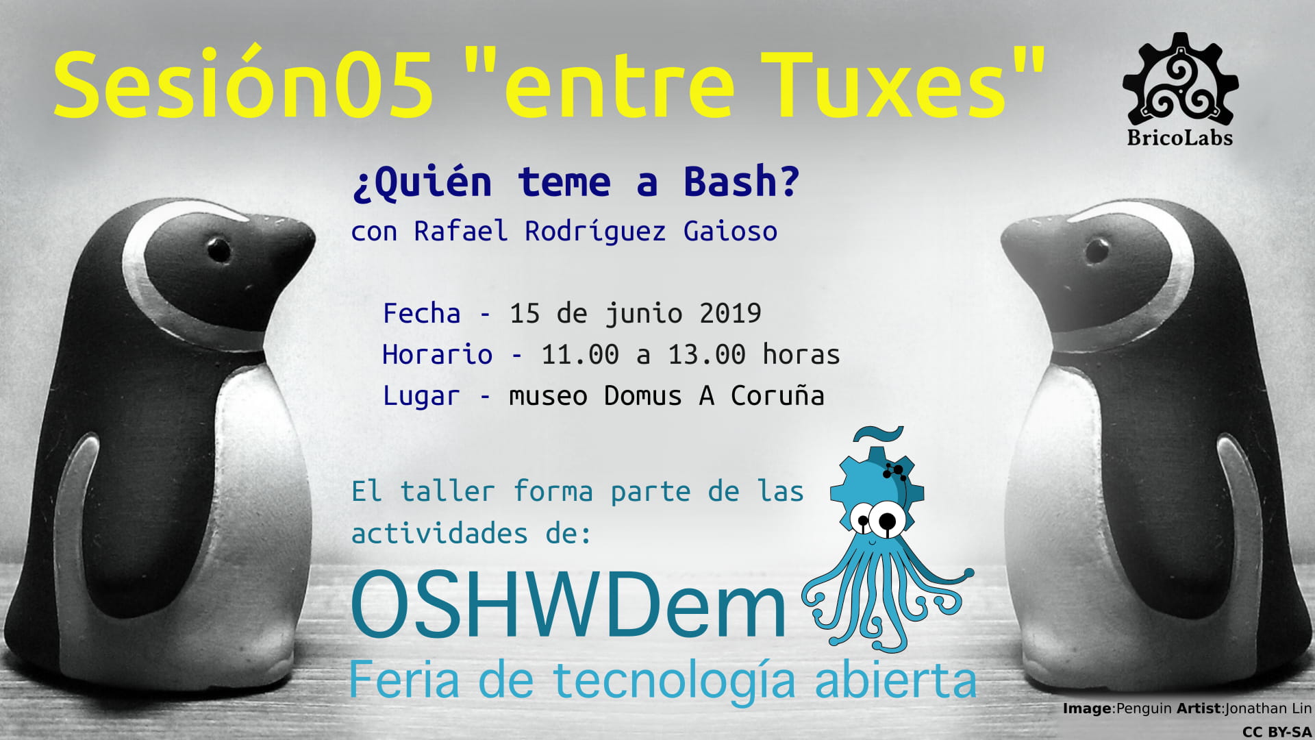El 15 de junio, en horario de 11.00 a 13.00, Bricolabs organiza un taller sobre el uso del terminal en un sistema gnu/linux llamado «¿Quién teme la Bash?» dentro de las sesiones «entre Tuxes», las cuales forman parte del programa de actividades de la OSHWDem 2019.
