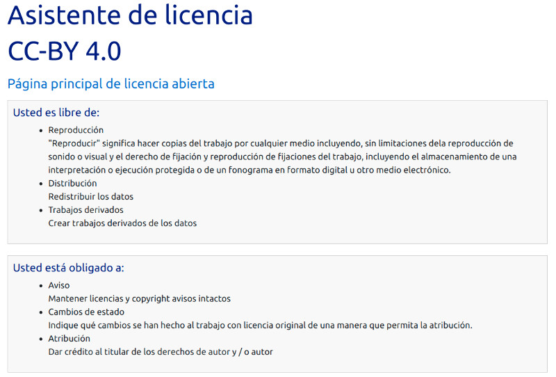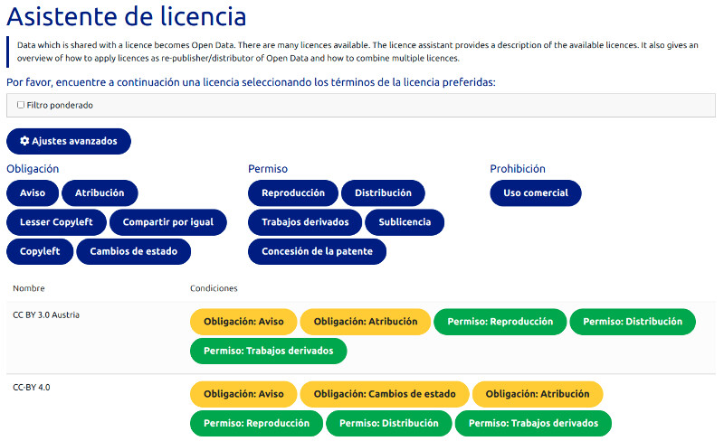A ferramenta facilita a comprensión de cada un dos tipos de licenza, axudando a determinar cales son as obrigacións que se asumen e as limitacións ás que se han de someter os tratamentos da información.