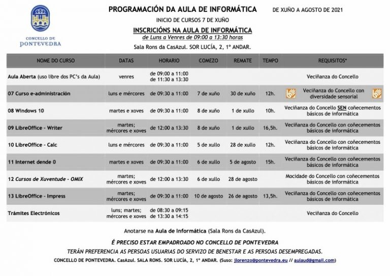 As inscricións para as actividades formativas, que impartirá o monitor de Informática da Área de Benestar Social do Concello, poderán realizarse a través das direccións de correo electrónico jlorenzo@pontevedra.eu e aulaud@gmail.com ou ben directamente na Aula de Informática, de luns a venres entre as 9:00 e as 13:30 horas.