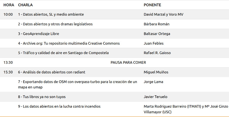 E nesta táboa podedes ver as charlas que terán lugar no evento, ademais dos seus relatores: