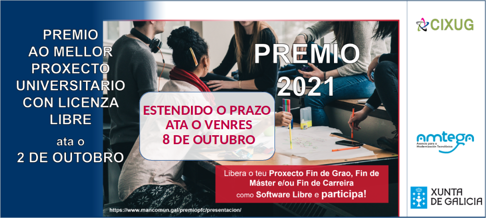 O Consorcio para o desenvolvemento de aplicacións para a Xestión Universitaria (CIXUG) en colaboración co Axencia para a Modernización Tecnolóxica de Galicia (Amtega), convoca a XIV edición do Premio ao Mellor Proxecto Universitario con Licenza Libre co obxectivo de fomentar e achegar as universitarias e universitarios galegos ao software libre e ás posibilidades de emprego que lles pode abrir a publicación ou colaboración con proxectos libres.