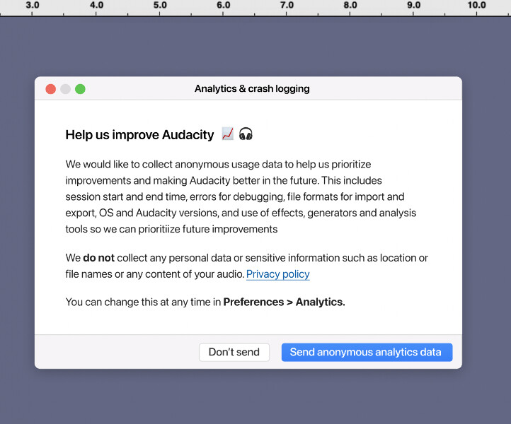 Unha das primeiras novidades introducidas en Audacity foi a telemetría na aplicación que enviará datos a Google Analytics e Yandex Metrica: