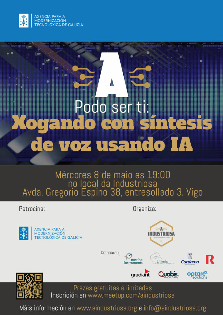 El miércoles, 8 de mayo a las 19.00 horas, tendrá lugar la charla «Puedo ser tú: Jugando con síntesis de voz usando IA«, en el local de A Industriosa (Avda. Gregorio Espino 38 entresuelo 3 – Vigo).