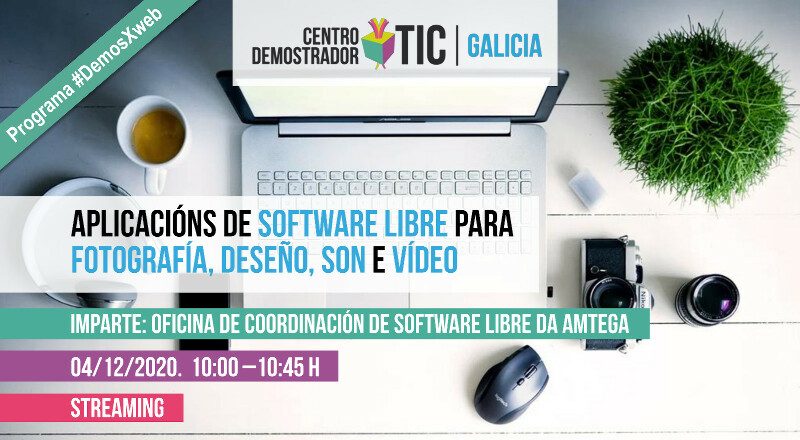 O próximo 4 de decembro de 2020, en horario de 10:00 a 10:45, terá lugar a sesión “Aplicacións de software libre para fotografía, deseño, son e vídeo” por streaming.