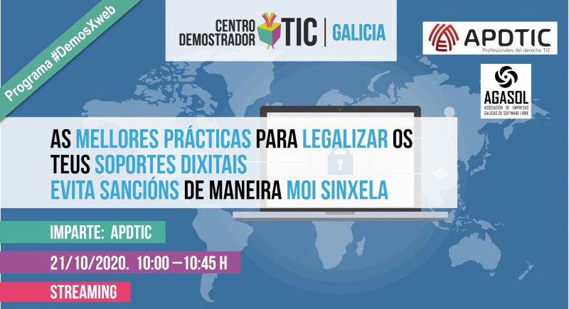 O próximo 21 de outubro, de 10.00 a 10.45 horas, terá lugar por streaming a charla sobre “As mellores prácticas para legalizar os teus soportes dixitais. Evita sancións de maneira moi sinxela. APDTIC”.