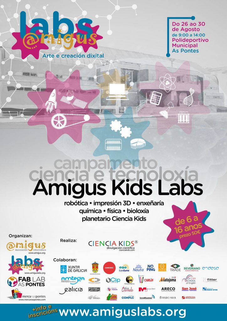 A Asociación Informática Amigus organiza, en colaboración con CIENCIA KIDS, un campamento de ciencia e tecnoloxía do 26 ao 30 de agosto no Pavillón Polideportivo Municipal de As Pontes en horario de 9:00 a 14:00.