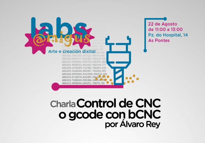 O sábado 22 de agosto, terá lugar a charla en Amigus Labs de “Control de CNC, o gcode con bCNC” con Álvaro Rey de Maker Gal. Explicará o proceso de creación do ficheiro gcode desde bCNC e envío a CNC.