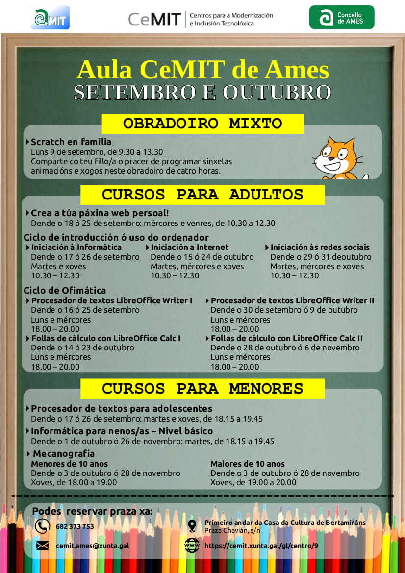 – Pasar pola aula en horario de aula aberta (cando non hai cursos) no primeiro andar da Casa da Cultura de Bertamiráns.