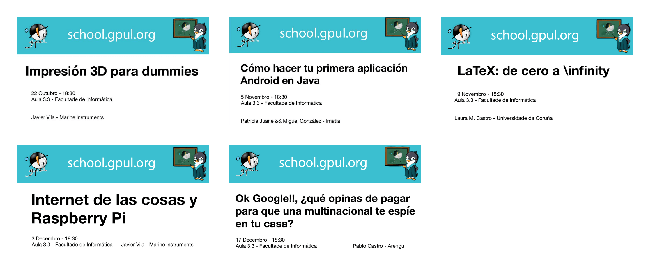 GPUL School é unha iniciativa que pretende achegar a membros da comunidade universitaria, ou a calquera interesado da sociedade, ás tecnoloxías libres sen necesidade de coñecementos previos.