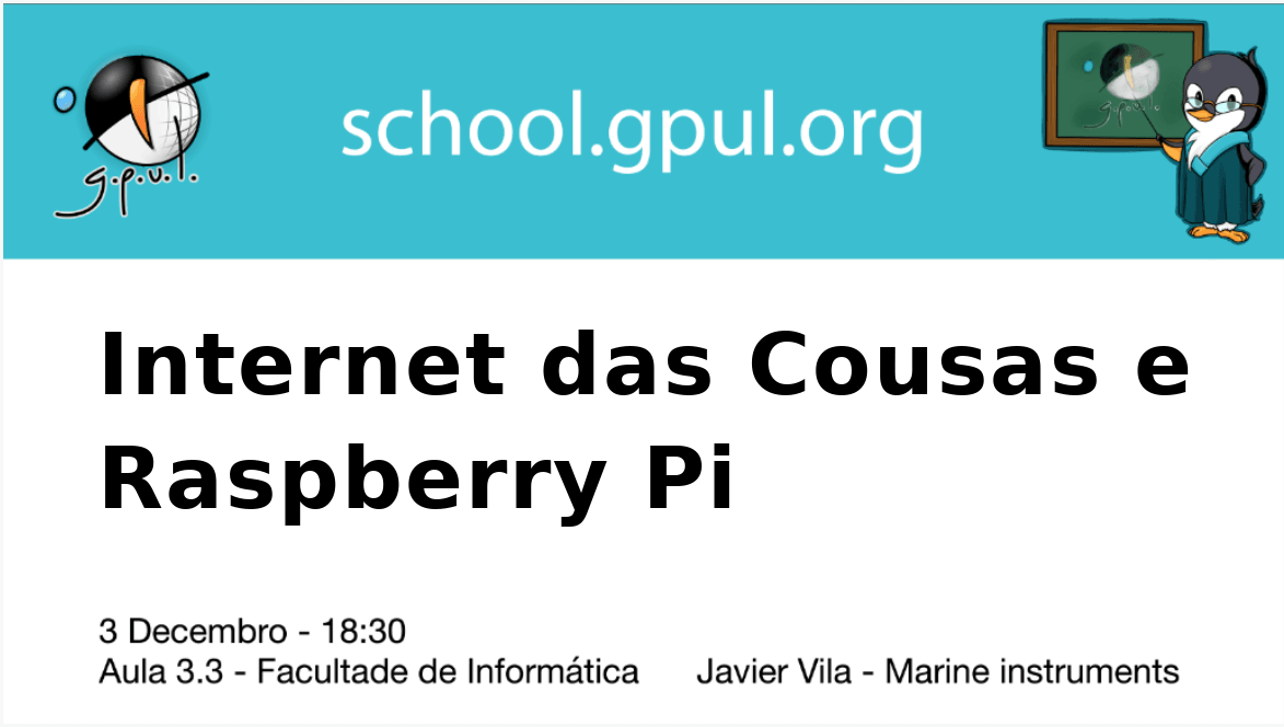 O martes 3 de decembro de 18:30 a 20:00, terá lugar na aula 3.3 da Facultade de Informática de A Coruña, unha nova charla sobre “Internet das Cousas e Raspberry Pi” dentro das actividades de GPUL School.