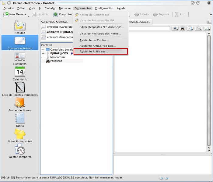 Unha vez instalado o software necesario, procedemos a configurar Kmail desde o menú “Ferramentas -> Asistente Anti-Virus …”