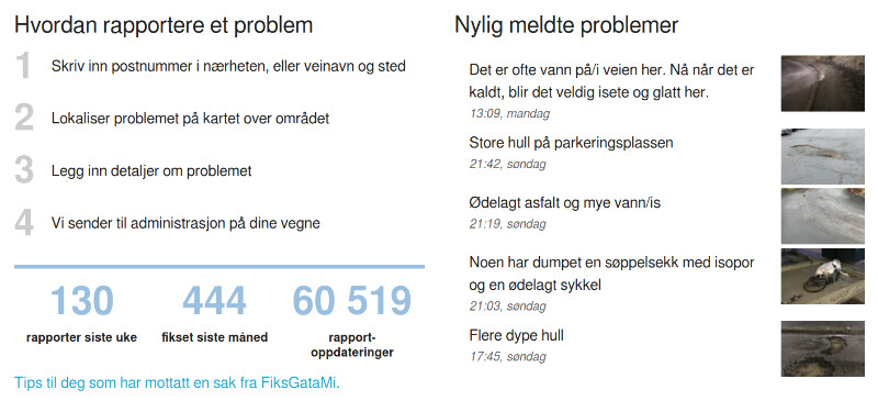 FiksGataMi comezará o seu décimo ano de operacións en Noruega. De media, o servizo tivo 3.500 usuarios únicos por ano desde 2011. Nos primeiros meses (marzo-xullo), o número de usuarios foi de 3.700, segundo informa Joinup nun artigo de 2011.