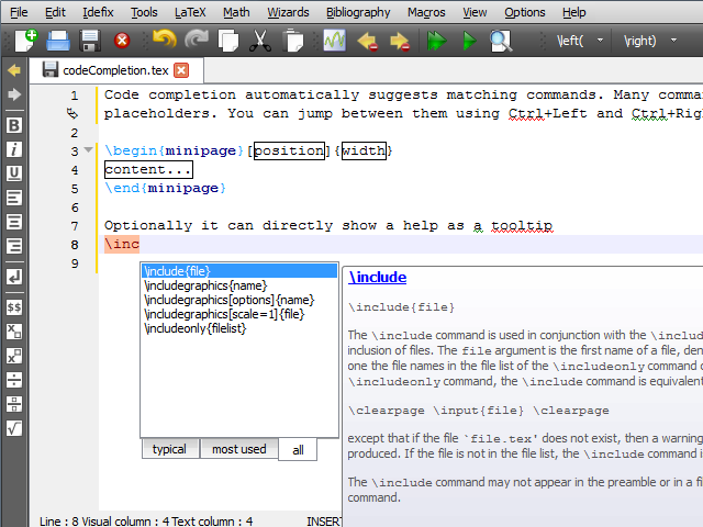 Funcións destacadas: marcadores, autocompletado de comandos, coloreado de sintaxes, menús, soporte de arrastrar imaxes, asistente para a creación de táboas, fórmulas, soporte integrado de diversos compiladores de LaTeX e máis de 1.000 símbolos matemáticos, entre outros.