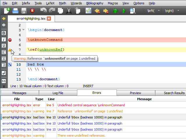– Visualización clara de erros e advertencias de LaTeX.