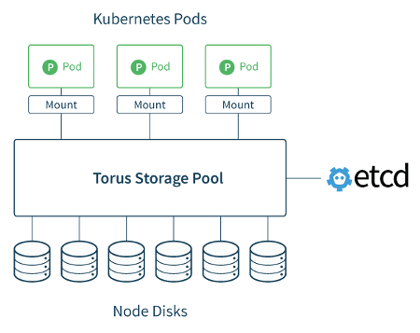 En esencia, Torus é unha biblioteca cunha interface que se amosa como un arquivo tradicional, permitindo o manexo de almacenamento por medio de operacións de ficheiro básicos. Coordinada e regulada a través do servicio ETCD.