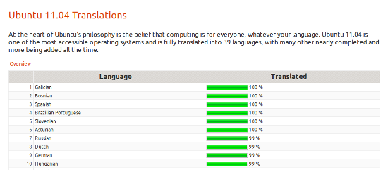A pouco máis dunha semana da saída da nova versión de Ubuntu 11.04 prevista para o vindeiro día 28 de abril, podemos comprobar que o galego será unhas das poucas linguas nas que estará dispoñible integramente, segundo figura nas estatísticas oficiais das traducións de Ubuntu, onde o galego ocupa o primeiro lugar.