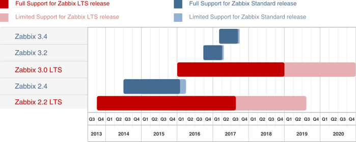 Para cada lanzamento de versión estable, cada ano e medio, Zabbix recibe un servizo de soporte de cinco anos (5 anos). Son as que se coñecen como as versións LTS (Long Time Support) de Zabbix e que na actualidade son Zabbix 2.0, Zabbix 2.2 e Zabbix 3.0 LTS.